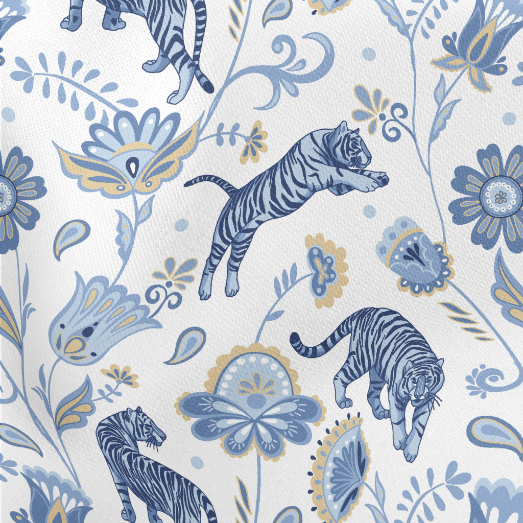 Nordic Blue Tiger And Flowers Lightweight Cotton Poplin
