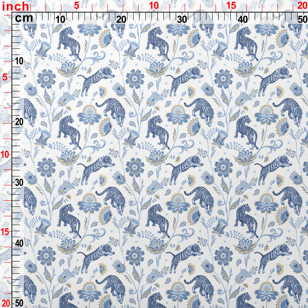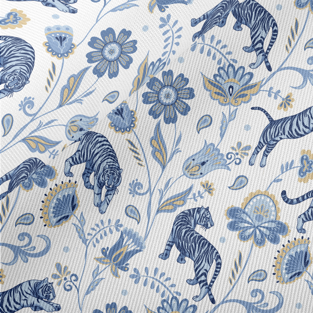 Nordic Blue Tiger And Flowers Midweight Cotton Poplin